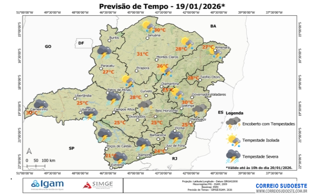 As temperaturas máximas variam entre 21°C e 31°C. Um volume alto de chuva é previsto entre a Zona da Mata e o Norte de Minas (60 - 80 mm).