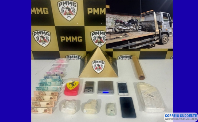 Em continuidade às diligências, o suspeito levou a equipe até sua residência, onde entregou mais um tablete de maconha, acompanhado de outra balança de precisão. A motocicleta utilizada estava com licenciamento vencido.