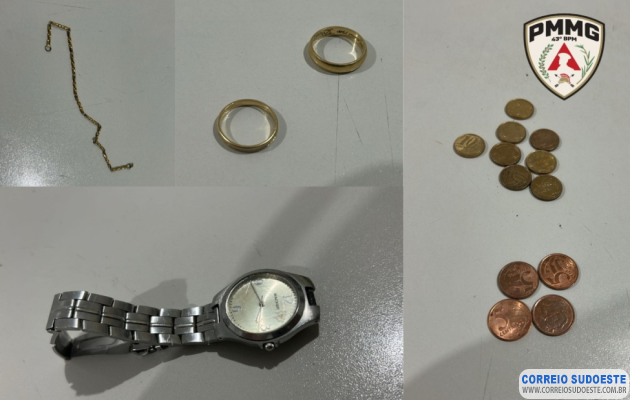 O homem, de 39 anos, foi identificado e, durante busca pessoal, foram encontrados em sua posse uma pulseira de ouro, duas alianças de ouro, um relógio e a quantia de R$ 1,00 em moedas. O local foi isolado e a perícia técnica acionada para os trabalhos de praxe.